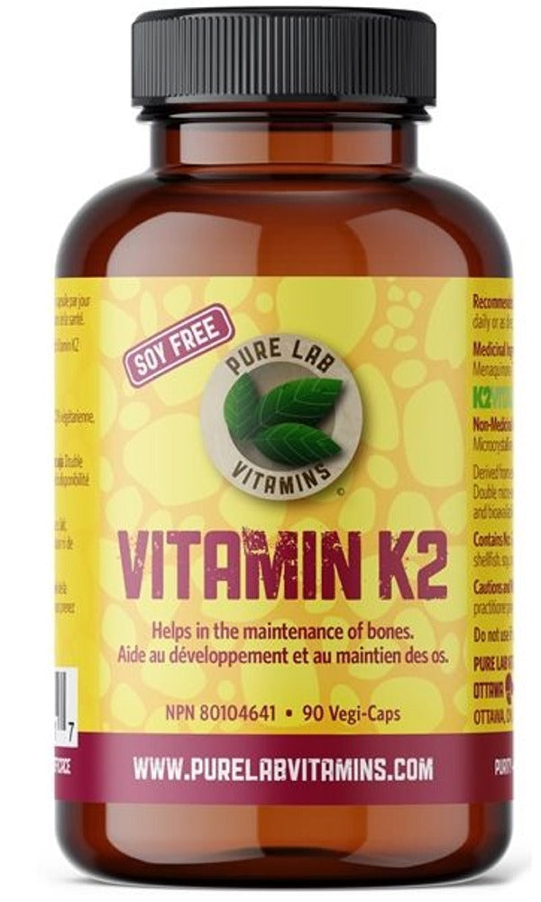 Pure Lab Vitamins - Vitamin K2 - 90 Veg Capsules - NPN: 80104641 -- Vitamin K-2 (menaquinone) is one of several forms of the essential nutrient that is vitamin K. While vitamin K-1 (phylloquinone) is best known for its role in blood coagulation, K-2 plays an essential role in the development and maintenance of the human skeleton by activating two key bone proteins: osteocalcin and matrix Gia protein (MGP). Although it supports calcium deposition into the bone mineral matrix, vitamin K-2 also appears to keep calcium from depositing in soft tissues. For this reason, it may have a protective role against atherosclerosis in the maintenance of arterial flexibility. In essence, K-2 MK-7 ensures that calcium is sent to where it should be--not to where it doesnt belong.